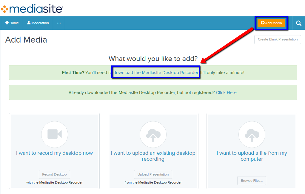 The desktop recorder can be accessed and downloaded from your My Mediasite account to your personal device to create new video presentations.